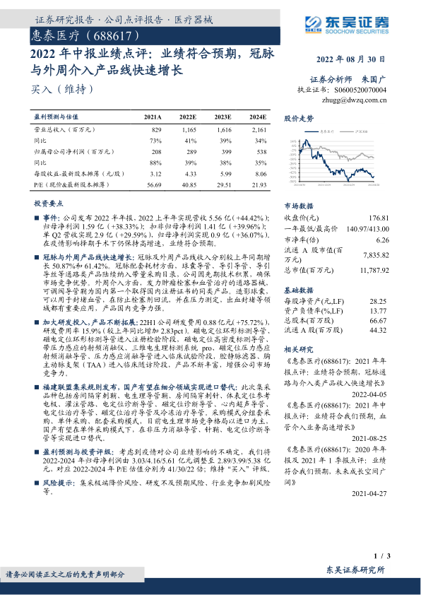 2022年中报业绩点评:业绩符合预期,冠脉与外周介入产品线快速增长