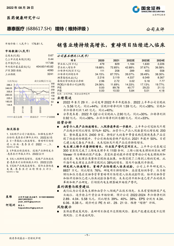 本报告分析了惠泰医疗2022年半年度报告,指出公司在血管介入和电生理领域具备技术优势,受益于国产替代趋势,业绩有望持续增长。同时,报告也提示了医保政策、研发进度、产能建设和汇率波动等风险。维持“增持”评级,并给出了未来盈利预测。