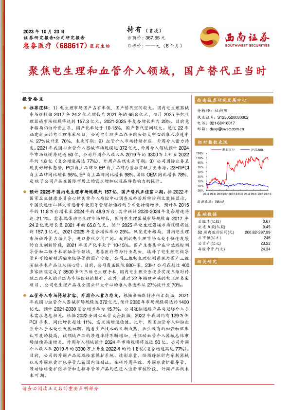盈利预测与投资建议:公司是国产电生理及血管介入的头部企业,公司产线丰富且产品性能优异。随着未来市场需求及市场份额的进一步扩大,预计头部效应将愈发明显,国产替代未来可期。我们预计未来三年归母净利润复合增长率为32.9%,首次覆盖给予“持有”评级。