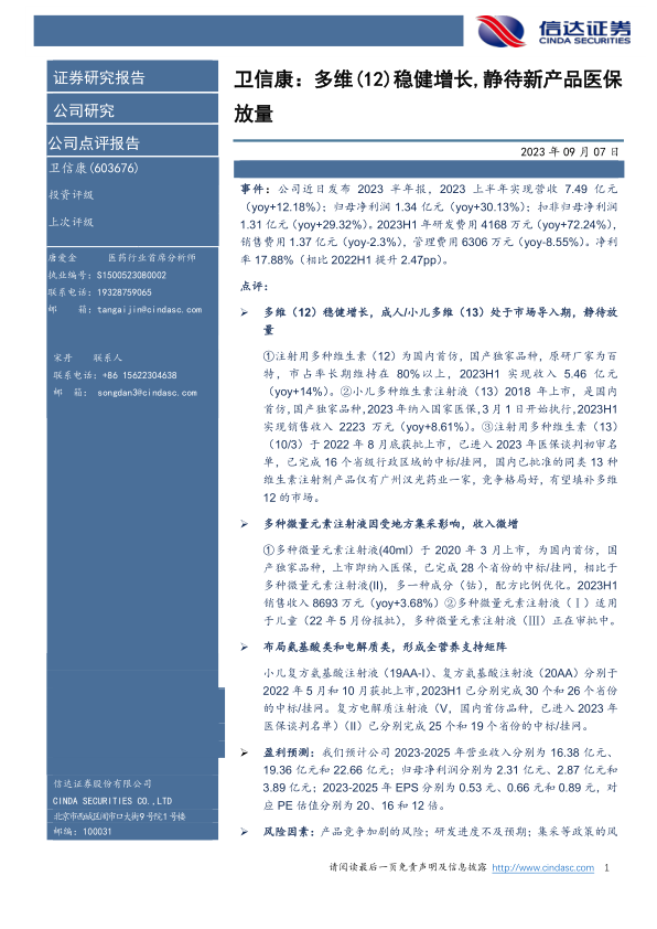 卫信康2023年上半年业绩表现稳健,核心产品多维(12)保持增长势头,新产品多维(13)有望受益于医保政策放量。公司积极布局氨基酸类和电解质类产品,构建全营养支持矩阵,为未来业绩增长提供新的动力。 考虑到公司良好的发展前景,维持对公司的盈利预测,但同时也需关注产品竞争、研发进度以及集采政策等风险因素。