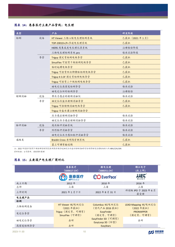 公司多元化布局电生理、冠脉介入与外周介入三大心血管核心赛道:1)电生理:作为国产电生理龙头之一,充分受益于电生理器械“市场大+渗透率低+集采加速国产替代”成长逻辑;2)冠脉介入:公司为细分领域龙头,产品布局完善,有望享受PCI手术量稳步增长红利;3)外周介入:为公司未来增长引擎,管线逐步扩展至治疗类产品,长期增长空间广阔。公司多元化布局心血管三大核心细分赛道,未来增长可期。首次覆盖惠泰医疗,给予“买入”评级,目标价人民币454元。
