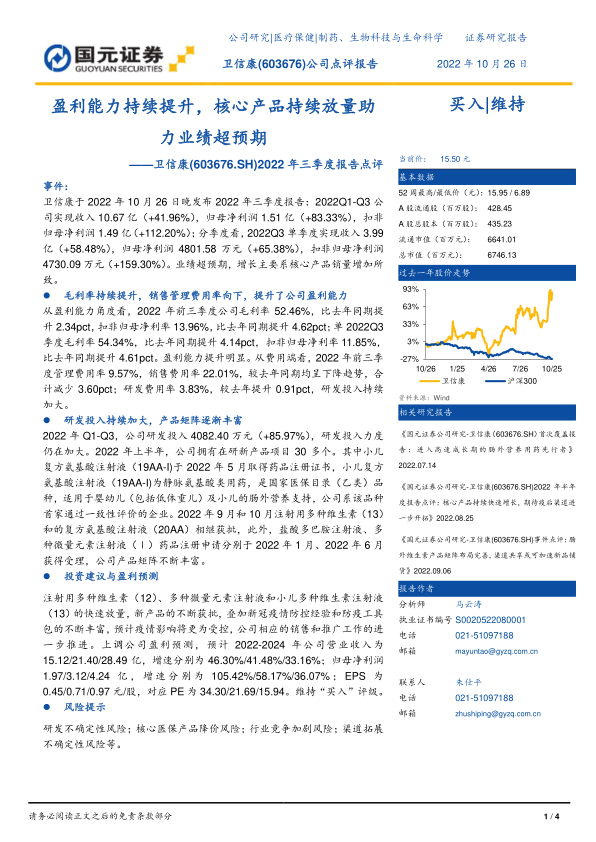 卫信康2022年三季度业绩表现亮眼,营收和净利润均实现超预期增长,盈利能力显著提升,产品矩阵不断丰富。公司通过加大研发投入、有效控制费用,以及核心产品的持续放量,实现了业绩的快速增长。维持“买入”评级,但同时也需关注研发风险、医保降价风险、行业竞争风险和渠道拓展风险。