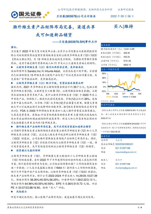 注射用多种维生素(12)、多种微量元素注射液和小儿多种维生素注射液(13)的快速放量, 叠加 2022 年下半年疫情防控经验和防疫工具包的不断丰富, 预计疫情影响将更为受控,公司相应的销售和推广工作的逐渐恢复和进一步推进;小儿复方氨基酸注射液(19AA-1) 挂网准入工作的积极推进,预计今年可能开始产生业绩贡献; 注射用多种维生素(13)(10/3)的获批,维生素产品矩阵齐全。预计公司 2022-2024 年营业收入 14.29/20.10/27.39亿,增速分别为 38.26%/40.55%/36.25%;归母净利润 1.58/2.22/3.13 亿,增速分别为 64.96%/40.55%/40.93%; EPS 为 0.36/0.51/0.72 元/股,对应PE 为 33.57/23.88/16.95。维持“买入”评级。