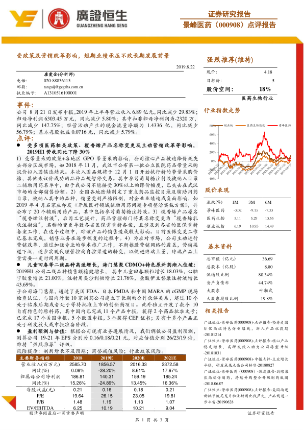 景峰医药在2019年上半年受带量采购、辅助用药目录、产品名称变更及营销改革等多重因素影响,短期业绩承压,营收和扣非归母净利润出现显著下滑。然而,公司通过优化产品结构,推动儿童回春等二线品种实现高速增长,并积极发展子公司海门慧聚的CDMO和特色原料药业务,取得了显著进展,为公司培育了新的增长点。尽管短期盈利预测有所下调,但分析师维持“强烈推荐”评级,表明市场对公司长期发展前景,特别是其国际化高端特色仿创路线和新业务的增长潜力持乐观态度。公司未来发展将依赖于其战略调整的有效性以及新业务的持续贡献。