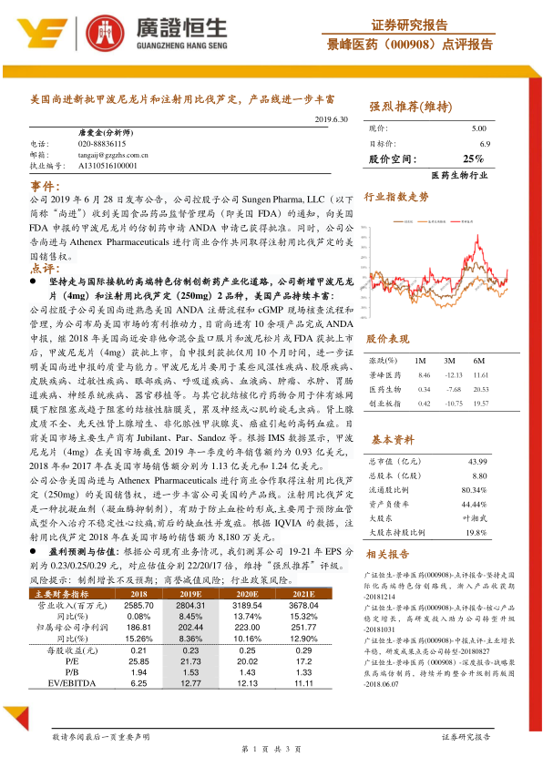 新获批的甲泼尼龙片和注射用比伐芦定在美国市场具有可观的销售潜力,根据IMS和IQVIA的数据,两款产品在历史年度均展现出数千万至上亿美元的市场规模,有望为公司带来新的业绩增长点。分析师基于对公司现有业务的深入分析,预测景峰医药在2019年至2021年期间的每股收益将持续增长,并维持“强烈推荐”的投资评级,目标价6.9元,预示着积极的股价上涨空间。尽管公司面临制剂增长不及预期、商誉减值和行业政策等潜在风险,但其在国际化高端仿制药领域的积极布局和产品线的持续丰富,预示着公司未来业绩增长的良好前景和市场竞争力的进一步提升。