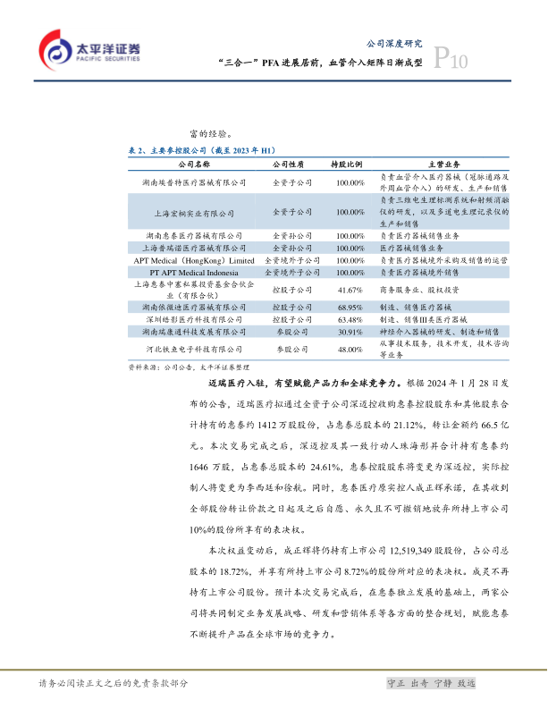 根据公司2024年1月28日发布的公告,深迈控及其一致行动人珠海彤昇合计持有惠泰约1646万股,占惠泰总股本的24.61%,惠泰控股股东将变更为深迈控。预计本次交易完成后,在惠泰独立发展的基础上,两家公司将共同制定业务发展战略、研发和营销体系等各方面的整合规划,赋能惠泰不断提升产品在全球市场的竞争力。