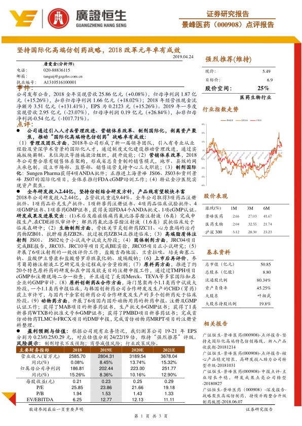 景峰医药坚持国际化高端仿创药战略,通过管理、营销和研发等多方面的改革,公司运营效率和创新能力得到提升。