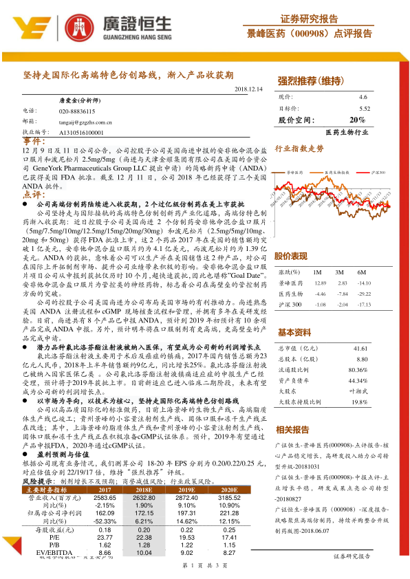 景峰医药通过坚持国际化高端特色仿创路线,已成功使其高端仿制药产品线进入收获期,特别是美国FDA批准的安非他命混合盐口服片和泼尼松片,为公司带来了显著的国际市场机遇和业绩增长潜力。同时,国内潜力品种氟比洛芬酯注射液被纳入医保,并有望在2019年获批上市,将成为公司新的利润增长点。公司在生产线升级和国际cGMP认证方面的持续投入,进一步巩固了其在全球制药市场的竞争力。尽管存在制剂增长不及预期、商誉减值及行业政策等风险,但基于其清晰的战略布局、产品线的积极进展和稳健的财务预测,分析师维持“强烈推荐”评级,认为公司未来发展前景广阔。