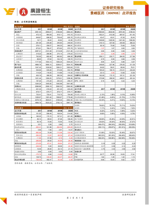 以下为景峰医药2017年至2020年(预测)的主要财务指标概览: