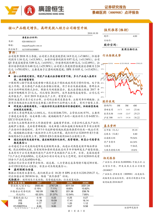 景峰医药在2018年前三季度展现出稳健的财务增长,核心产品销售表现良好,并有氟比洛芬酯注射液等明星产品即将上市,有望贡献新的增长动力。公司持续高强度的研发投入,聚焦于仿制药一致性评价、注射剂再评价及创新药开发,正积极推动公司向高端制药领域转型升级。同时,通过美国尚进公司积极拓展国际市场,并获得高管增持,进一步增强了市场对公司未来发展的信心。基于对公司业务的分析和未来增长潜力,报告维持“强烈推荐”评级,但提醒投资者关注制剂增长、商誉减值及行业政策等潜在风险。