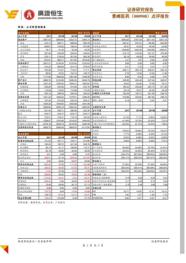 根据公司现有业务情况,分析师测算公司2018-2020年EPS分别为0.22元、0.25元和0.27元,对应估值分别为20倍、18倍和16倍。报告维持对景峰医药的“强烈推荐”评级。