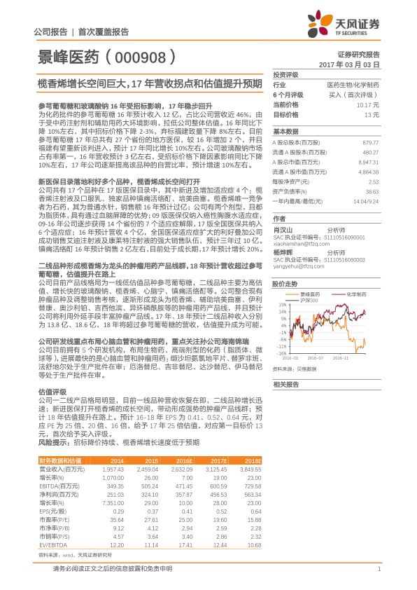 本报告认为,景峰医药正处于转型期,二线品种的快速增长和肿瘤产品线的完善将成为公司未来发展的主要驱动力。其中,榄香烯作为核心品种,在新医保目录的推动下,市场潜力巨大。预计公司估值将在18年得到提升,首次给予“买入”评级,目标价13元。但同时也需关注招标降价和榄香烯增长速度低于预期的风险。