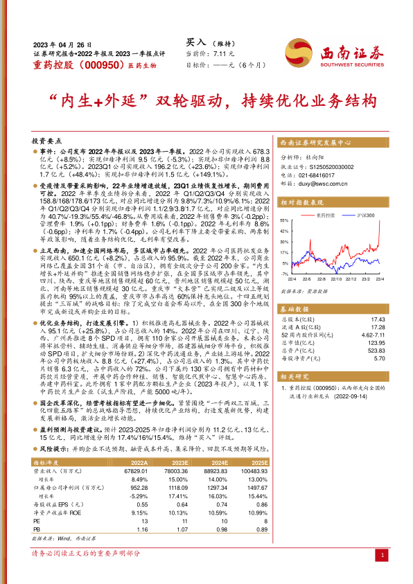 本报告分析了重药控股(000950)2022年年报和2023年一季报,并维持“买入”评级。