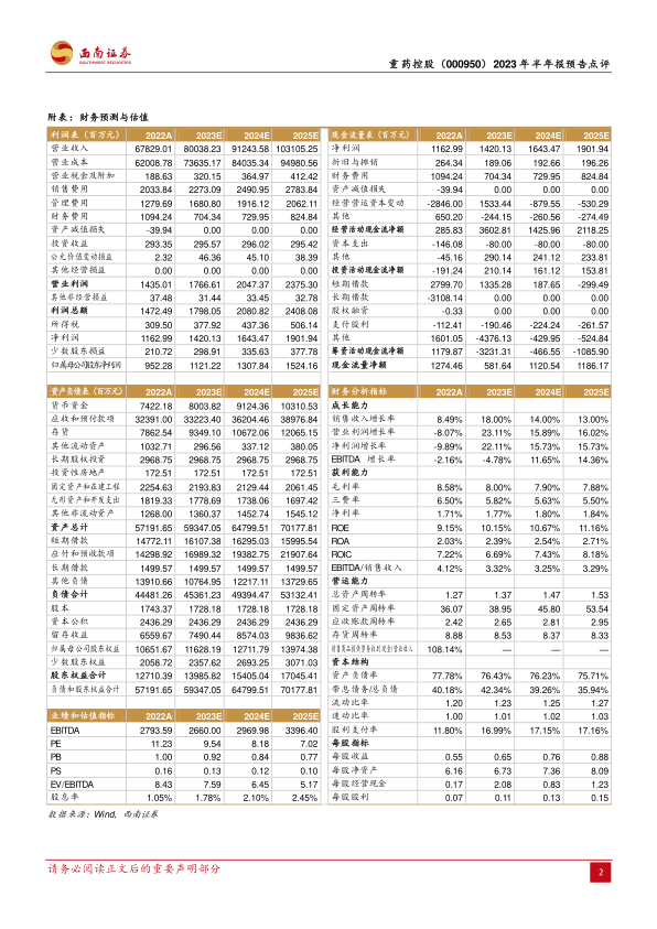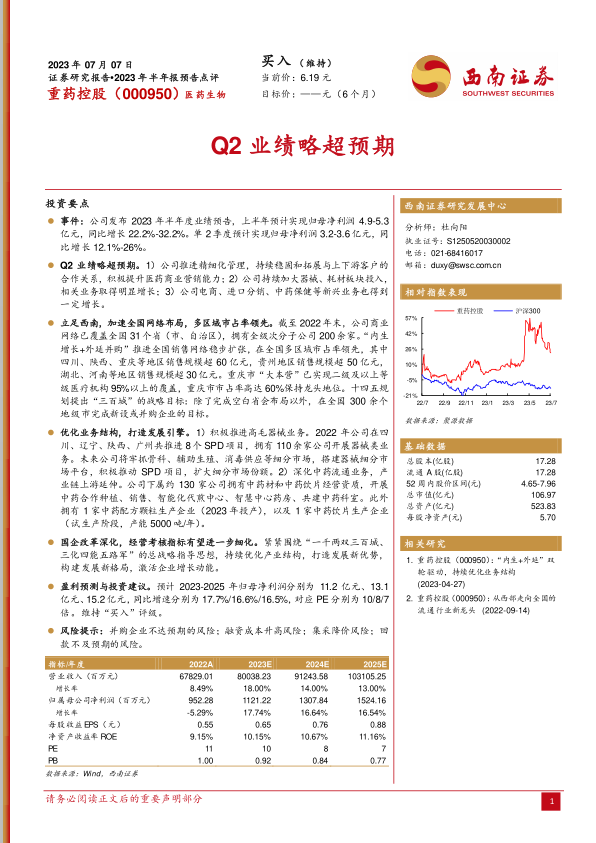 本报告分析了重药控股(000950)2023年半年度业绩预告,并维持“买入”评级。
