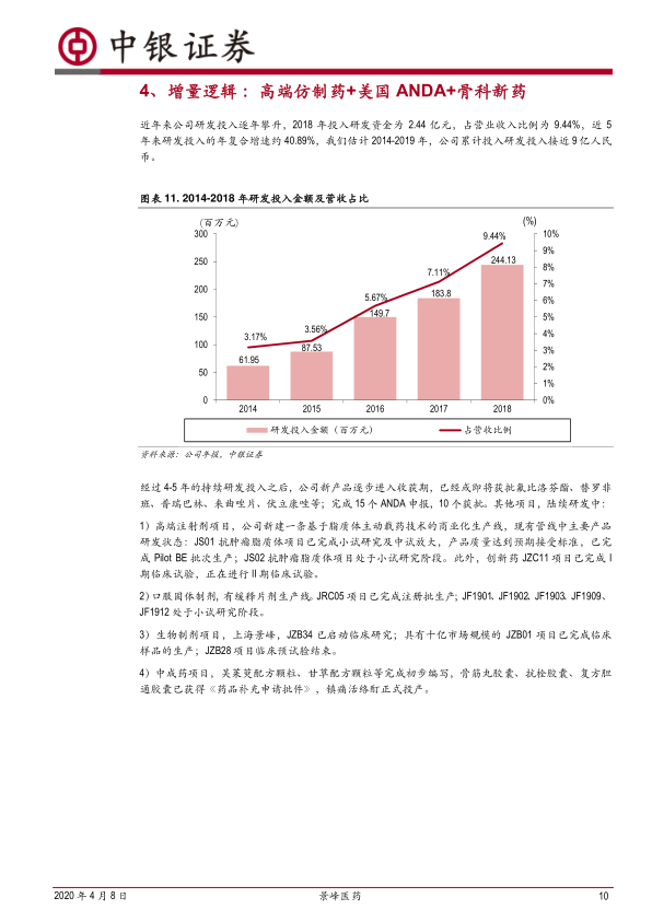 公司近年来研发投入逐年攀升,2018年投入2.44亿元,占营收9.44%,近5年研发投入年复合增速约40.89%,累计投入接近9亿人民币。经过持续投入,公司新产品逐步进入收获期,包括已获批或即将获批的氟比洛芬酯、替罗非班、普瑞巴林、来曲唑片、伏立康唑等国内仿制药,以及完成15个ANDA申报(10个获批)的美国仿制药。此外,公司还在高端注射剂、口服固体制剂、生物制剂和中成药领域有多个项目在研。