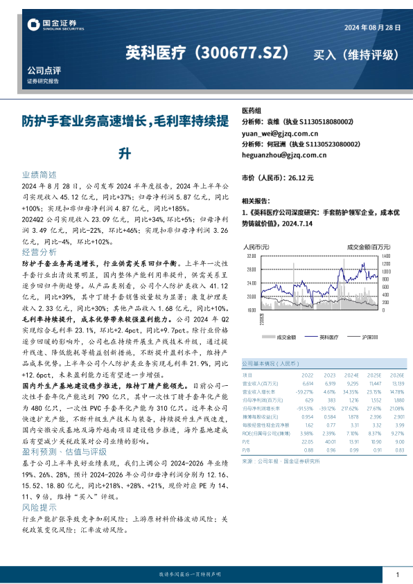 基于公司上半年良好业绩表现,上调公司2024-2026年业绩19%、26%、28%,预计2024-2026年公司归母净利润分别为12.16、15.52、18.80亿元,同比+218%、+28%、+21%,现价对应PE为14、11、9倍,维持“买入”评级。