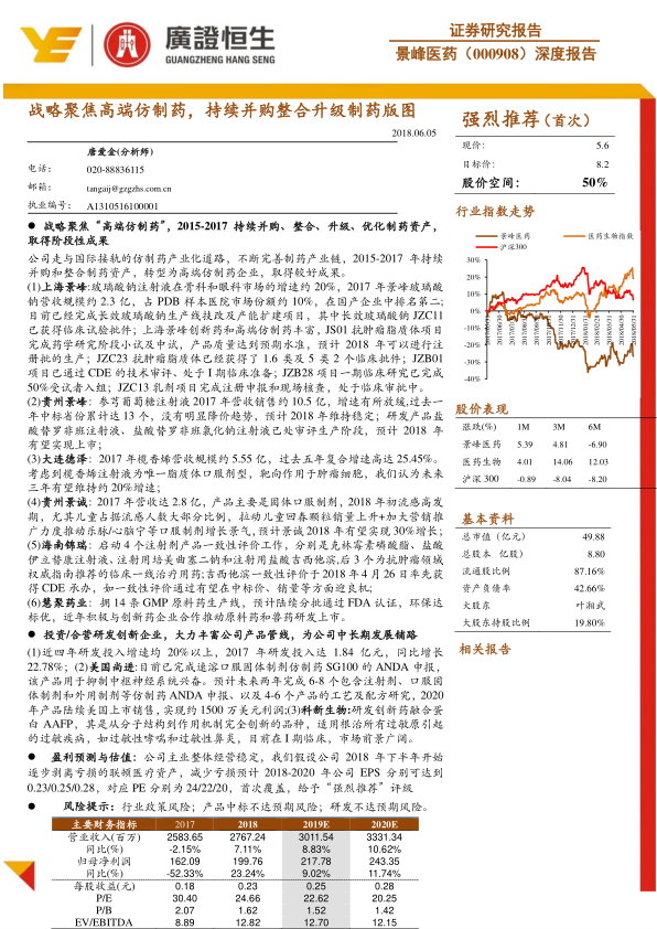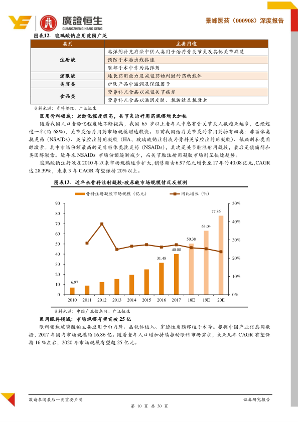 上海景峰作为景峰医药的全资子公司,其核心产品玻璃酸钠在骨科和眼科市场表现强劲。2017年,景峰玻璃酸钠营收规模约2.3亿元,在PDB样本医院市场份额约10%,位居国产企业第二。玻璃酸钠市场规模持续扩大,骨科领域从2010年的6.97亿元增长至2017年的40.08亿元,复合年增长率(CAGR)达28.39%,预计未来三年CAGR有望保持20%以上;眼科领域2017年市场规模约16.86亿元,预计2020年有望突破25亿元。为应对市场竞争,上海景峰已完成长效玻璃酸钠生产线技改及产能扩建,并研发了HA1(交联玻璃酸钠注射液)和HA2(玻璃酸钠曲安奈德复方注射剂)等国家一类新药,以及JZC11注射液等长效制剂,这些产品有望在未来大幅提升玻璃酸钠的营收。此外,上海景峰在研项目丰富,包括JZC23、JS01等抗肿瘤脂质体,以及JZB01、JZB28等创新药及高端仿制药,为公司长远发展奠定基础。