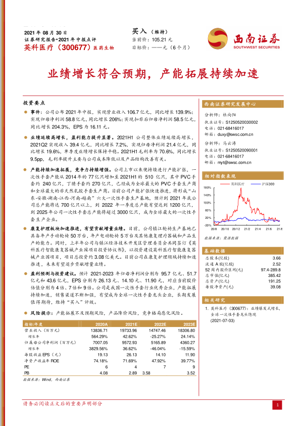 本报告对英科医疗(300677)2021年中报进行了深度分析,核心观点如下: