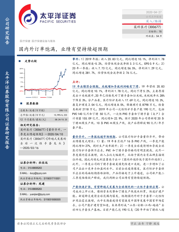 英科医疗在一次性手套市场具有显著的竞争优势,受益于全球疫情带来的市场需求增长和公司自身的产能扩张计划,未来业绩有望持续超预期。报告维持“买入”评级,并给出了相应的盈利预测和估值分析,为投资者提供了有价值的参考信息。