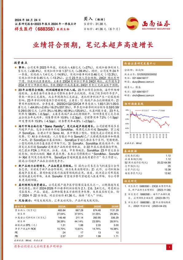 本报告对祥生医疗2023年年报及2024年一季报进行了深入分析,指出公司业绩符合预期,海外市场和笔记本超声是增长亮点,新产品合作和应用领域拓展是未来增长点。虽然短期业绩受到一些因素的影响,但考虑到公司的竞争优势和未来成长性,维持“买入”评级。同时,报告也提示了研发、汇率和产品升级等方面的风险。