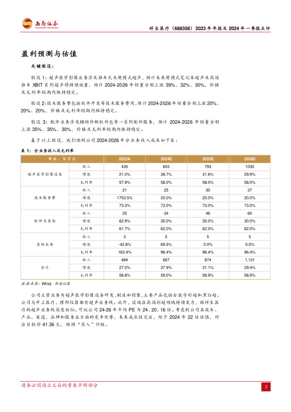盈利预测与投资建议。公司是国产超声医学影像设备龙头之一,以便携超为差异化特色。预计2024-2026年归母净利润分别为2.1、2.6、3.4亿元,考虑到公司在技术、产品、渠道、品牌和服务五方面的竞争优势,未来成长性突出,给予2024年22倍估值,对应目标价41.36元,维持“买入”评级。