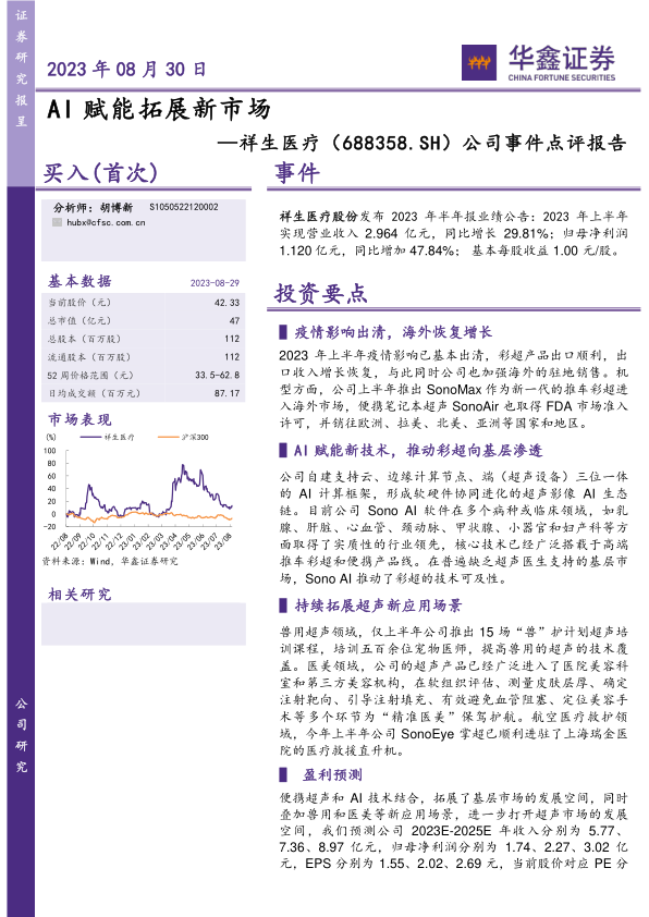 祥生医疗在2023年上半年业绩表现亮眼,受益于疫情影响消退和海外市场恢复增长。公司积极拥抱AI技术,并将其应用于彩超产品,推动了技术在基层市场的普及。同时,公司不断拓展超声的应用场景,如兽用、医美和航空医疗救护等领域,为未来的发展打开了新的空间。 报告预测公司未来三年收入和利润将保持快速增长,并首次覆盖,给予“买入”投资评级,但也提示了医疗反腐、市场竞争、产品价格和汇率波动等风险。