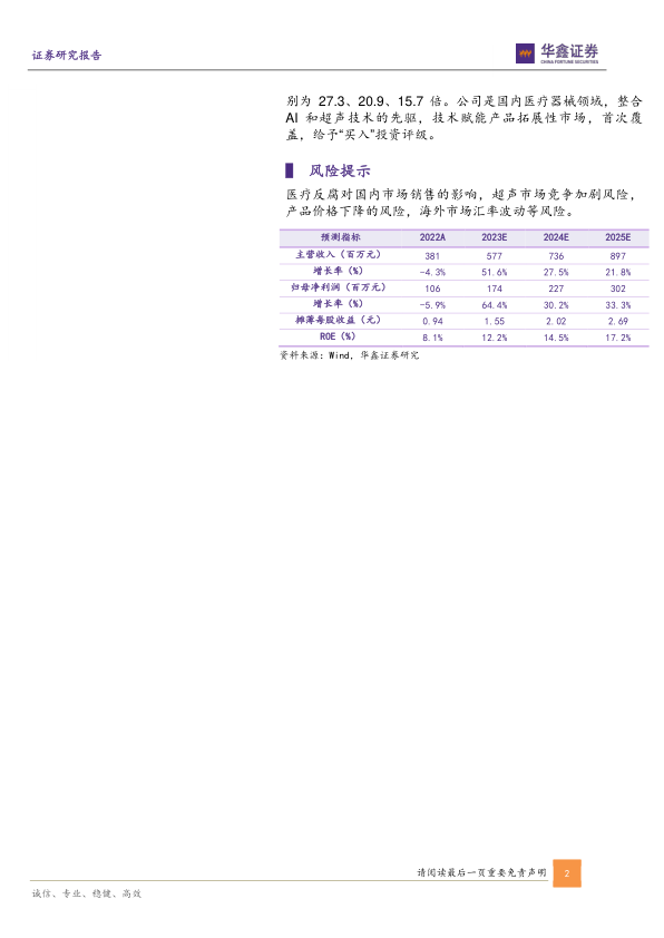 便携超声和AI技术结合,拓展了基层市场的发展空间,同时叠加兽用和医美等新应用场景,进一步打开超声市场的发展空间,我们预测公司2023E-2025E年收入分别为5.77、7.36、8.97亿元,归母净利润分别为1.74、2.27、3.02亿元,EPS分别为1.55、2.02、2.69元,当前股价对应PE分别为27.3、20.9、15.7倍。公司是国内医疗器械领域,整合AI和超声技术的先驱,技术赋能产品拓展性市场,首次覆盖,给予“买入”投资评级。