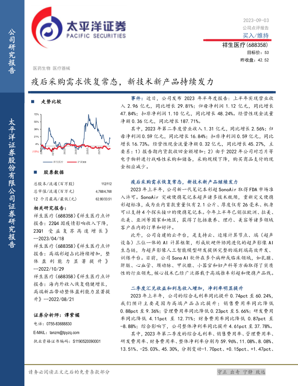 祥生医疗2023年上半年业绩表现亮眼,受益于疫情后市场需求的复苏和公司在技术创新方面的投入。新产品SonoAir的成功上市以及AI云平台的构建,为公司未来的发展奠定了坚实的基础。同时,公司通过优化费用结构,有效提升了盈利能力。太平洋证券维持对祥生医疗的“买入”评级,并对其未来发展持乐观态度。