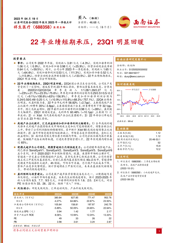 盈利预测与投资建议。公司是国产超声医学影像设备龙头之一,以便携超为差异化特色,以海外市场为基本盘,未来内生业绩高速增长,预计2023-2025年收入分别为6.3、7.7、9.5亿元,归母净利润分别为1.6、2.0、2.4亿元,对应PE估值分别为33、26、22倍,维持“买入”评级。