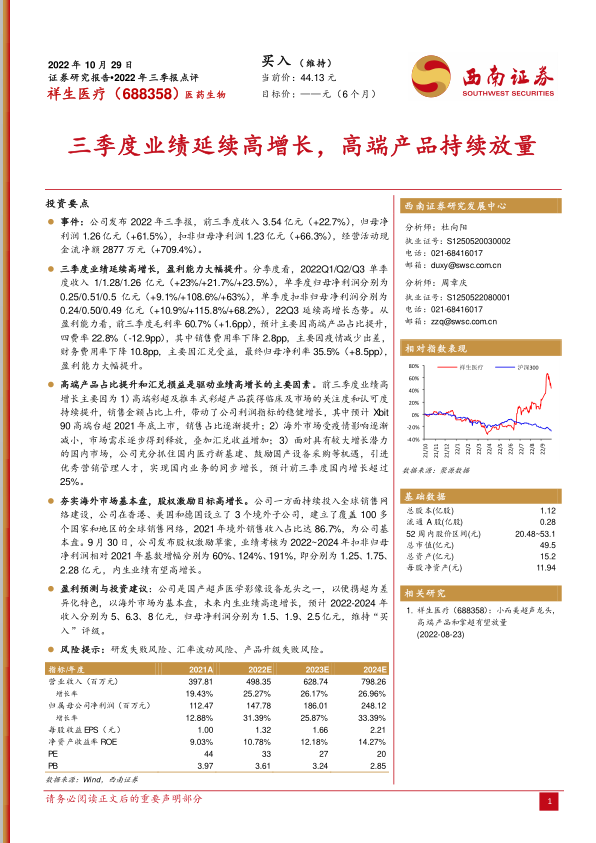 本报告对祥生医疗2022年三季报进行了深入分析,公司三季度业绩延续高增长态势,盈利能力大幅提升。高端产品占比提升和汇兑损益是驱动业绩增长的主要因素。公司在夯实海外市场基本盘的同时,积极拓展国内市场,并制定了股权激励计划,有望实现内生业绩的高速增长。维持“买入”评级,但同时也提示了相关风险。