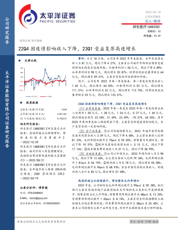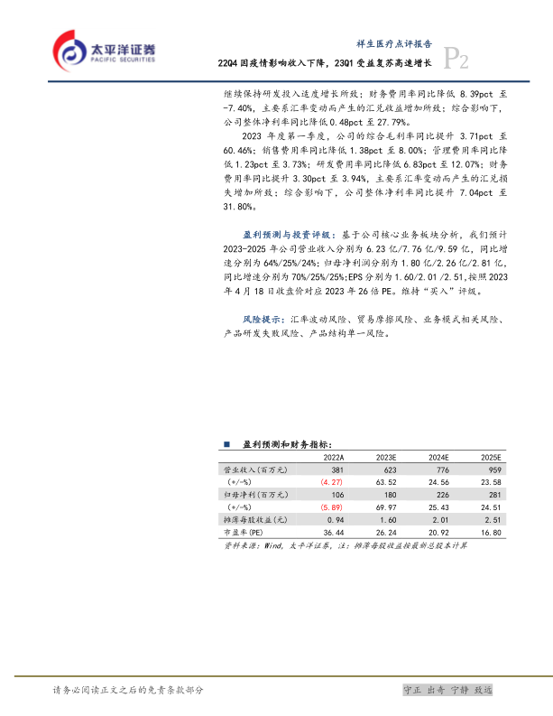 祥生医疗在2022年受到疫情影响,业绩有所下滑,但在2023年第一季度受益于市场复苏,实现了营收和利润的大幅增长。公司高端彩超产品占比提升,带动整体毛利率增加,显示出较强的盈利能力。太平洋证券维持对公司“买入”评级,并预测未来三年公司营收和利润将保持快速增长。同时,报告也提示了汇率波动、贸易摩擦等风险。