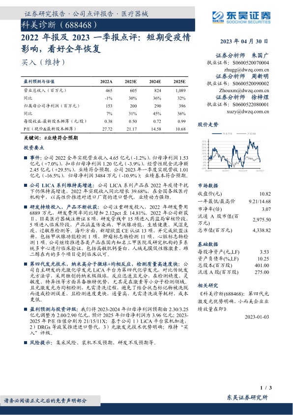 盈利预测与投资评级: 我们将 2023-2024 年归母净利润预期由 2.30/3.25亿元调整为 2.00/2.90 亿元,预计 2025 年归母净利润为 3.96 亿元; 2023-2025 年 P/E 估值分别为 21/15/11X;基于公司 1) LiCA 平台装机加速,2) DRGs 等政策推进进口替代, 3)光激发光技术优势明确;维持“买入”评级。