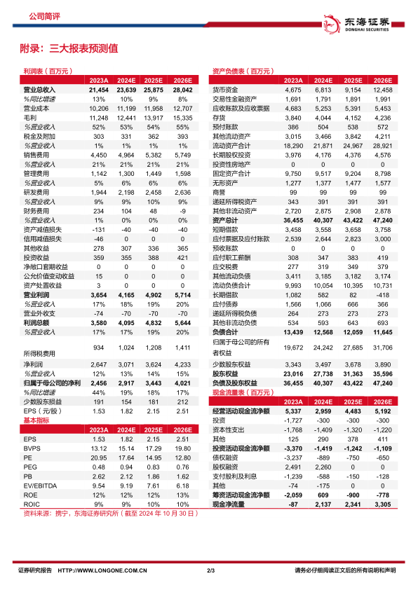 盈利能力持续提升。公司2024前三季度营业收入为167.89亿元(同比+6.64%),归母净利润24.71亿元(同比+25.85%),扣非归母净利润24.47亿元(同比+27.32%);其中,Q3单季度营业收入49.62亿元(同比+0.35%),归母净利润6.71亿元(同比+19.88%),扣非归母净利润6.93亿元(同比+21.16%)。费用方面,公司2024年前三季度销售费用率15.57%,同比-5.07pct,管理费用率5.84%,同比+1.35pct,研发费用率9.44%,同比-1.14%;Q3单季度销售费用率14.03%,同比-7.33pct,环比-0.53pct。经营性现金流净额为32.75亿元,同比-22.97%。公司费用优化明显,盈利能力持续提升。