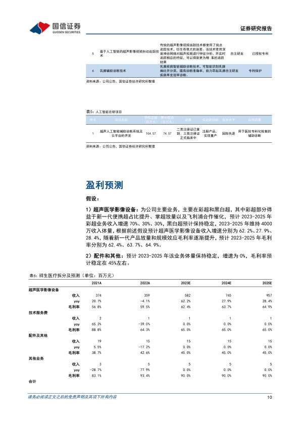 前瞻布局 AI+超声, 技术积累丰富。 目前, 基层人员缺乏专业的超声知识和技能是超声产品难以下层的关键原因, AI 辅助诊断软件可媲美高年资医生,“AI+” 赋能有望解决当前临床痛点。 此外, AI 辅助诊断软件还可提高诊断效率, 减轻医生负担。 公司及早布局 AI 领域, 相关研发已有初步收获, 公司积累 6 项核心技术, 多项领先国际, “乳腺疾病人工智能超声诊断软件”已处于临床试验阶段, SonoAI 多次参加人机大战并取得了优异成绩。