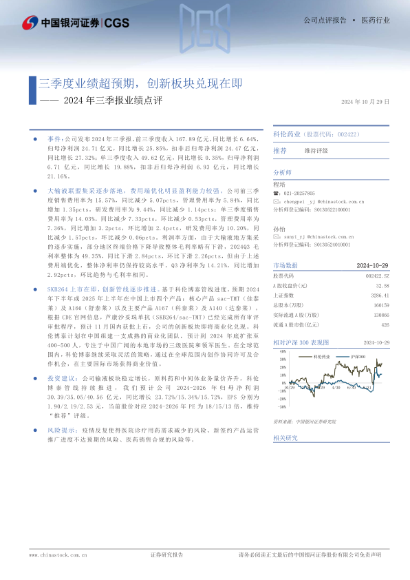 本报告对科伦药业2024年三季报进行了深入分析,指出公司业绩超预期,盈利能力提升,创新药商业化在即,维持“推荐”评级。报告强调了大输液集采的影响、费用优化策略、SKB264上市的重要性以及未来盈利增长的潜力。同时,报告也提示了疫情、新产品推广和合规等风险因素。