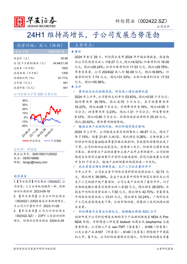 科伦药业2024年上半年业绩表现稳健,营收和净利润均实现增长。公司通过优化费用成本、升级产品结构、积极参与集采以及推进创新药研发等措施,提升了整体竞争力。华安证券维持“买入”评级,并对公司未来发展持乐观态度,但同时也提示了相关风险。