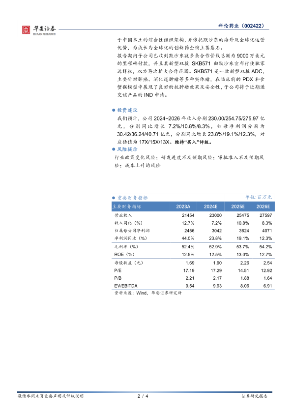 华安证券维持科伦药业“买入”评级,并预测公司未来三年营收和净利润将持续增长。报告同时提示了行业政策变化、研发进度、审批准入以及成本上升等潜在风险。