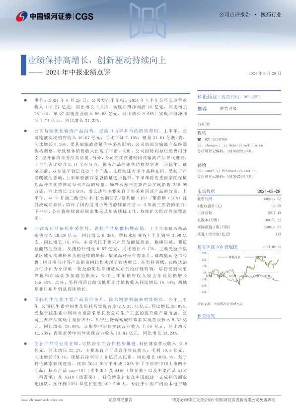 本报告对科伦药业2024年中报业绩进行了深入分析,核心观点如下:
