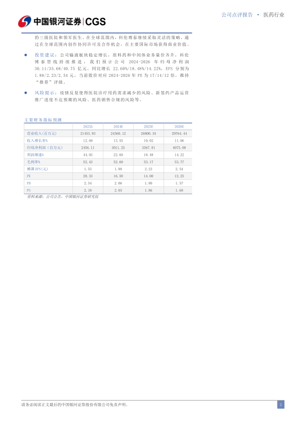 投资建议:公司输液板块稳定增长,原料药和中间体业务量价齐升,科伦博泰管线持续推进,我们预计公司2024-2026年归母净利润30.11/35.68/40.75亿元,同比增长22.60%/18.48%/14.22%,EPS分别为1.88/2.23/2.54元,当前股价对应2024-2026年PE为17/14/12倍,维持“推荐”评级。
