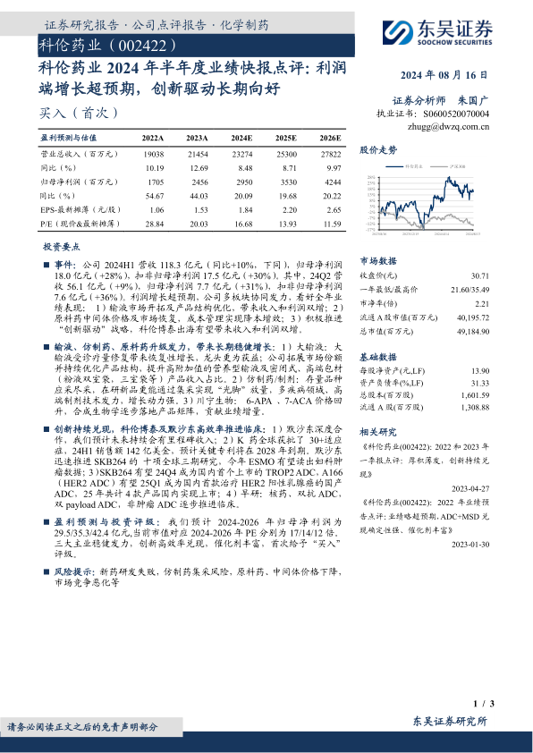 科伦药业2024年半年度业绩表现亮眼,利润增长超预期,主要得益于输液、仿制药和原料药三大业务的稳健增长以及创新药研发的加速兑现。公司与默沙东的合作持续深化,科伦博泰的创新药管线进展迅速,有望成为公司未来业绩增长的重要驱动力。报告首次给予“买入”评级,但同时也提示了新药研发、集采、原料药价格波动以及市场竞争等风险。