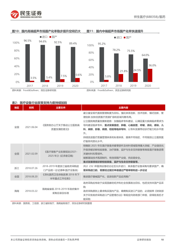 自身砥砺研发和销售,外引国际龙头为强援。 公司专注自主研发,供应链上整合高频阵列探头和换能器自主生产控制成本;产品在便携化上持续迭代,打造全球最轻薄的 SonoAir 笔记本超声,和真正随身携带的系列掌上超声,推车式超声 XBit90 等主打全球高端市场。软件上公司超前布局 AI 算法研发和针对具体应用场景的智能化软件,作为唯一数据获取者和中国医学超声人工智能联盟合作,建立数据资源核心壁垒,目前布局心脏、乳腺、妇产科等重要专科在内的 6个病种,并在 4个病种上实现突破。公司超声乳腺四分类人工智能(对应产品是四分类三维乳腺 AI 智能诊疗仪)已经拿到二类证且是国内首个推进三类证临床的人工智能超声产品。 销售上公司两端发力,高端市场通过便携式超声切入开拓市场,基层医疗自 2018年开始联合BD打通县域市场, 逐步渗透2000个县域市场。公司签约飞利浦共襄国内市场开拓,有望便携化智能化和渠道销售上强强联合、深度合作,对祥生打开二次增长曲线有较大意义。