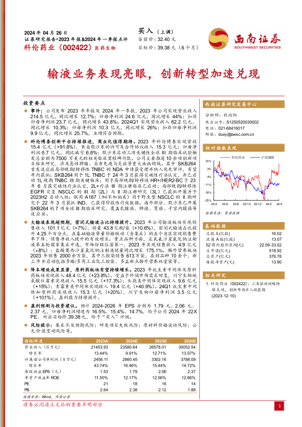 通过与复星医药、华润双鹤、华东医药、翰森制药等可比公司的估值对比,分析师认为科伦药业在产业升级、川宁生物分拆上市以及创新平台布局方面具有独特优势。给予公司2024年22倍PE,对应目标价39.38元,维持“买入”评级。