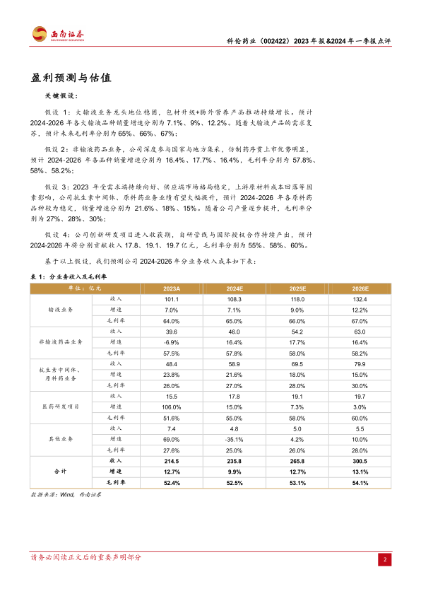基于对公司大输液业务的稳固地位、非输液药品集采优势、原料药板块的稳定增长以及创新研发项目进入收获期的关键假设,分析师预计科伦药业2024-2026年EPS分别为1.79元、2.06元、2.37元,归母净利润增速分别为16.5%、15.4%、14.7%。分业务来看,预计2024-2026年输液业务收入增速分别为7.1%、9.0%、12.2%,毛利率逐步提升至67.0%;非输液药品业务收入增速分别为16.4%、17.7%、16.4%,毛利率稳定在58%左右;抗生素中间体、原料药业务收入增速分别为21.6%、18.0%、15.0%,毛利率提升至30.0%;医药研发项目收入预计分别为17.8亿元、19.1亿元、19.7亿元,毛利率提升至60.0%。