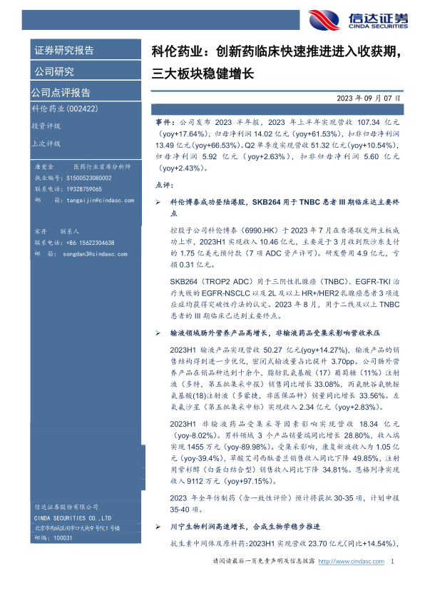 本报告对科伦药业2023年半年度报告进行了深入分析,核心观点如下:
