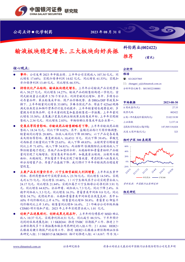 科伦药业在2023年上半年表现出色,输液板块稳健增长,原料药业务盈利能力提升,创新药研发取得积极进展。中国银河证券首次覆盖,给予“推荐”评级,看好公司未来发展前景。同时,报告也提示了投资者需要关注的潜在风险。