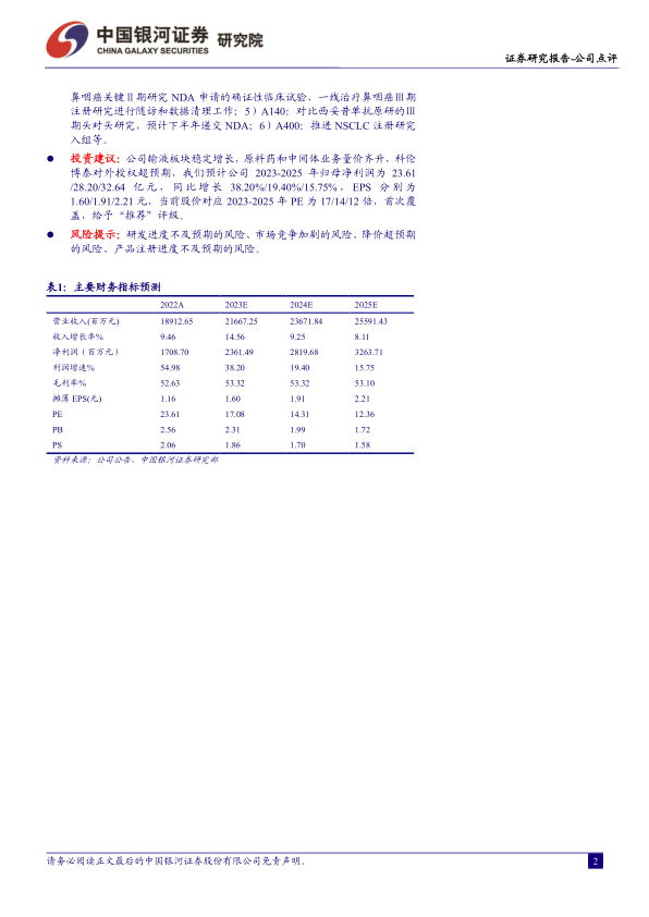 投资建议:公司输液板块稳定增长,原料药和中间体业务量价齐升,科伦博泰对外授权超预期,我们预计公司2023-2025年归母净利润为23.61/28.20/32.64亿元,同比增长38.20%/19.40%/15.75%,EPS分别为1.60/1.91/2.21元,当前股价对应2023-2025年PE为17/14/12倍,首次覆盖,给予“推荐”评级。