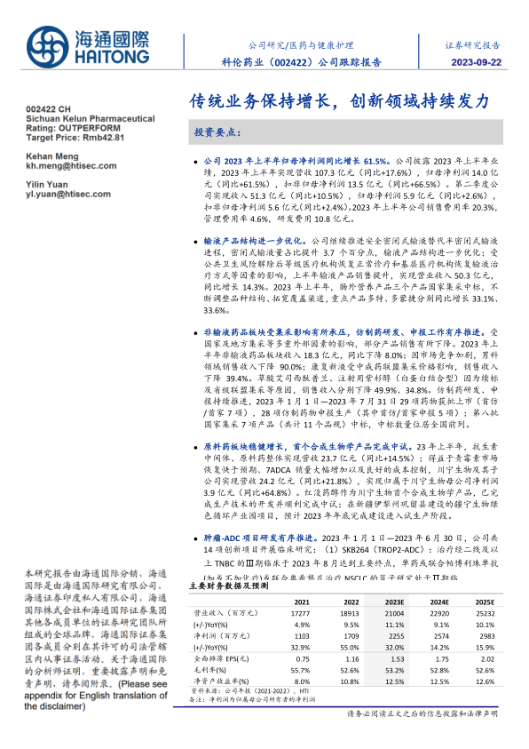 盈利与估值。 我们预计 2023-25 年归母净利润分别为 22.6 亿、 25.7 亿、 29.8 亿元,同比增长 32.0%、 14.2%、 15.9%, EPS分别为 1.53、 1.75、 2.02 元。考虑到公司传统输液业务表现稳定,仿制药业务稳健发展,原料药、中间体业务盈利能力逐步提升,创新药业务逐步进入收获期,我们给与其 2023 年 28 倍 PE,对应目标价 42.81 元, 首次覆盖,给予“优于大市”评级。