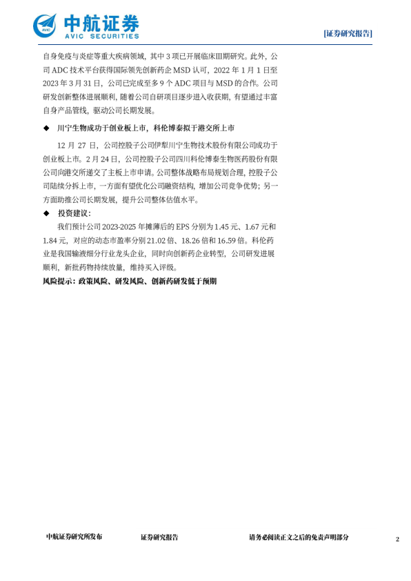 我们预计公司2023-2025年摊薄后的EPS分别为1.45元、1.67元和1.84元,对应的动态市盈率分别21.02倍、18.26倍和16.59倍。科伦药业是我国输液细分行业龙头企业,同时向创新药企业转型,公司研发进展顺利,新批药物持续放量,维持买入评级。