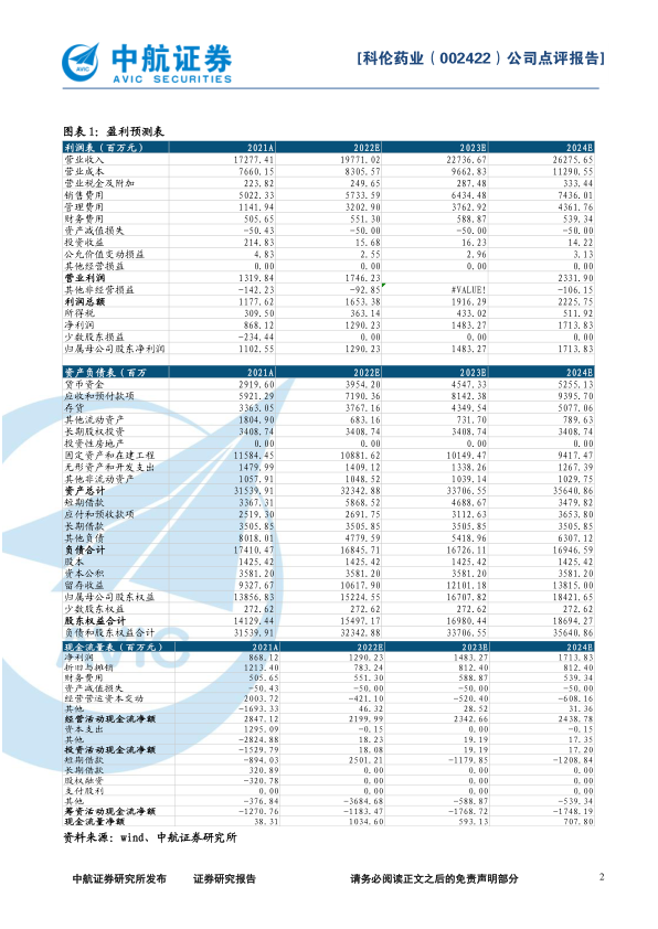 中航证券维持科伦药业“买入”评级,看好公司未来发展前景。但同时也提示了政策风险、研发风险、创新药研发低于预期等风险。