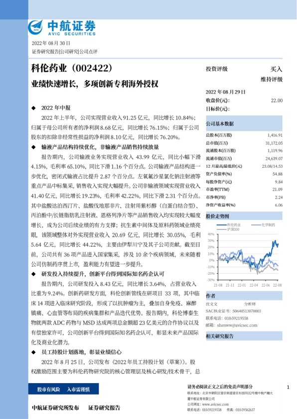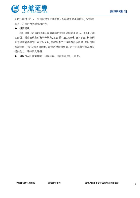 我们预计公司2022-2024年摊薄后的EPS分别为0.91元、1.04元和1.19元,对应的动态市盈率分别为24.21倍、21.16倍和18.41倍。科伦药业是我国输液细分行业龙头企业,在抗生素产业链具有竞争优势,并以仿制推动创新,公司研发进展顺利,新批药物持续放量,为公司未来业绩高增长提供动力。维持买入评级